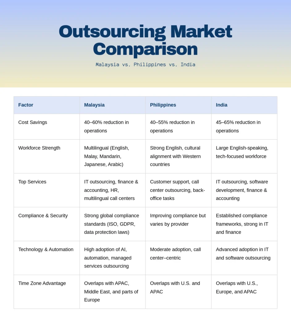 Malaysia acts as both an offshore hub for the U.S. and Europe and a nearshore provider for Asia-Pacific. This flexibility makes it attractive for global organizations with diverse operational needs.